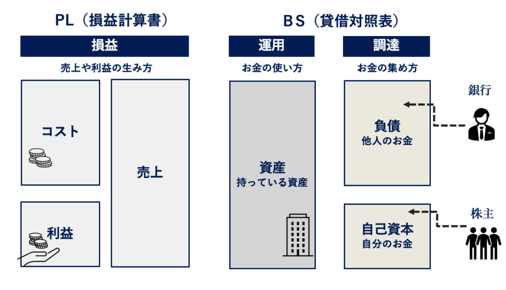 BSでは、右側には「負債(他者からの借入など)」と「純資産(株主からの出資・これまでの利益など)」の合計額、左側には「資産(現在保有している現金や所有物)」の合計額が記載され、左右は常に一致するようになっています。
