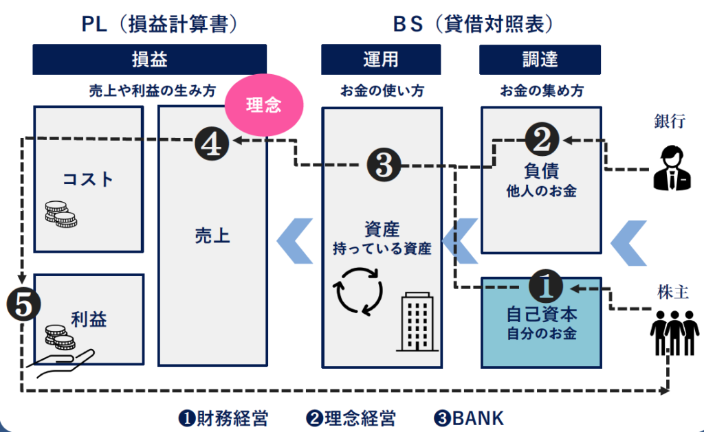 PLで得られた利益(⑤)はBSへと還流し、自己資本として積み上がる(①)ことで、次なる理念実現へ踏み出すために運用する資産(③)となります。
